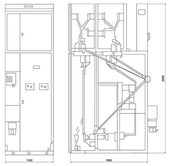 The cabinet is a metal enclosed armored structure, the cabinet skeleton is welded by angle steel, and the cabinet is divided into a circuit breaker room, a busbar room, a cable room, and a relay room, and the operation of the main components in the cabinet can be observed through the observation window and lighting on the façade. In order to improve the technical performance of the switchgear, the main components (such as circuit breakers, rotary disconnect switches, etc.) have been redesigned.